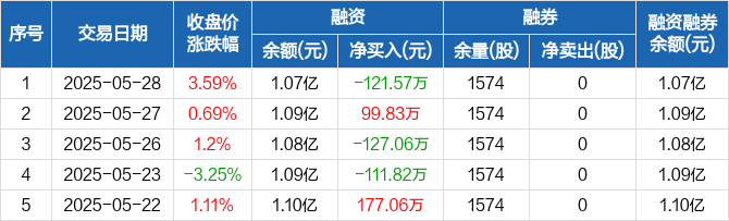 融资方面,当日融资买入341.96万元,融资偿还463.53万元,融资净偿还121.57万元。融券方面,融券卖出0股,融券偿还0股,融券余量1574股,融券余额4.99万元。融资融券余额合计1.07亿元。