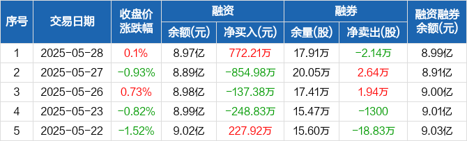 融资方面,当日融资买入1532.01万元,融资偿还759.8万元,融资净买入772.21万元。融券方面,融券卖出0股,融券偿还2.14万股,融券余量17.91万股,融券余额172.12万元。融资融券余额合计8.99亿元。