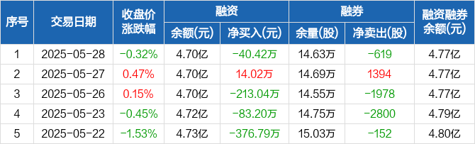融资方面,当日融资买入897.44万元,融资偿还937.85万元,融资净偿还40.42万元。融券方面,融券卖出700股,融券偿还1319股,融券余量14.63万股,融券余额685.44万元。融资融券余额合计4.77亿元。
