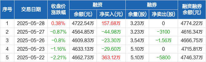 融资方面,当日融资买入386.39万元,融资偿还228.71万元,融资净买入157.68万元。融券方面,融券卖出0股,融券偿还0股,融券余量3.23万股,融券余额51.68万元。融资融券余额合计4774.22万元。
