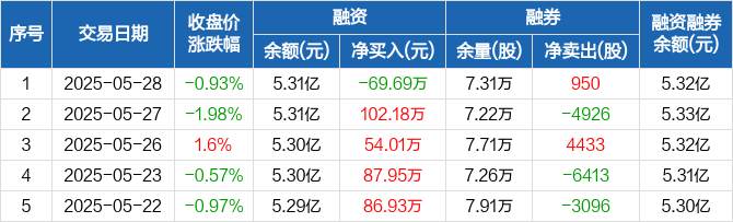 融资方面,当日融资买入609.74万元,融资偿还679.43万元,融资净偿还69.69万元。融券方面,融券卖出950股,融券偿还0股,融券余量7.31万股,融券余额139.56万元。融资融券余额合计5.32亿元。