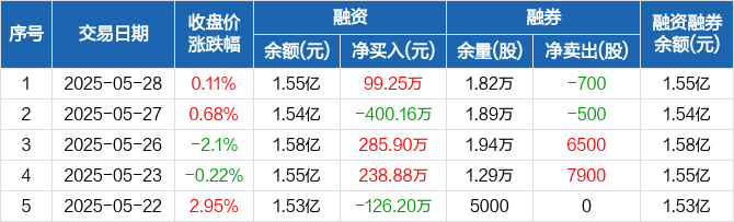 融资方面,当日融资买入1172.68万元,融资偿还1073.43万元,融资净买入99.25万元。融券方面,融券卖出0股,融券偿还700股,融券余量1.82万股,融券余额16.23万元。融资融券余额合计1.55亿元。