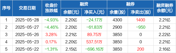融资方面,当日融资买入2314.23万元,融资偿还2338.41万元,融资净偿还24.17万元。融券方面,融券卖出1400股,融券偿还0股,融券余量4300股,融券余额107.71万元。融资融券余额合计2.21亿元。