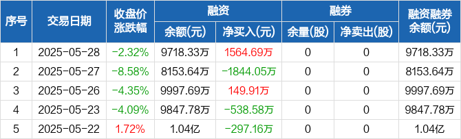 融资方面,当日融资买入3228.73万元,融资偿还1664.04万元,融资净买入1564.69万元。融券方面,融券卖出0股,融券偿还0股,融券余量0股,融券余额0元。融资融券余额合计9718.33万元。