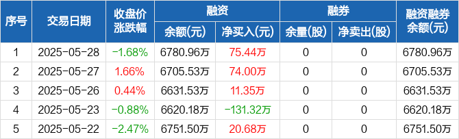 融资方面,当日融资买入169.48万元,融资偿还94.04万元,融资净买入75.44万元,连续3日净买入累计160.78万元。融券方面,融券卖出0股,融券偿还0股,融券余量0股,融券余额0元。融资融券余额合计6780.96万元。