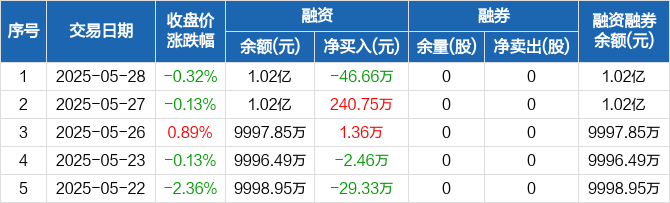融资方面,当日融资买入136.27万元,融资偿还182.93万元,融资净偿还46.66万元。融券方面,融券卖出0股,融券偿还0股,融券余量0股,融券余额0元。融资融券余额合计1.02亿元。