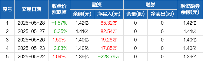 融资方面,当日融资买入408.61万元,融资偿还323.29万元,融资净买入85.32万元,连续4日净买入累计204.98万元。融券方面,融券卖出0股,融券偿还0股,融券余量0股,融券余额0元。融资融券余额合计1.42亿元。