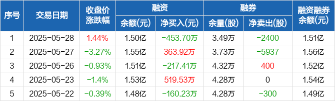 融资方面,当日融资买入500.27万元,融资偿还953.97万元,融资净偿还453.7万元。融券方面,融券卖出0股,融券偿还2400股,融券余量3.49万股,融券余额76.26万元。融资融券余额合计1.51亿元。