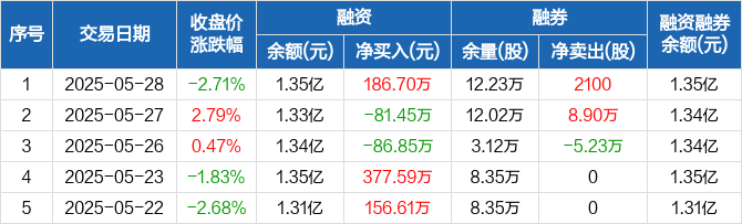 融资方面,当日融资买入499.42万元,融资偿还312.72万元,融资净买入186.7万元。融券方面,融券卖出2800股,融券偿还700股,融券余量12.23万股,融券余额26.29万元。融资融券余额合计1.35亿元。