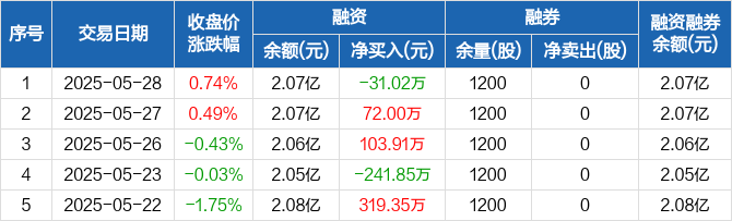 融资方面,当日融资买入154.17万元,融资偿还185.19万元,融资净偿还31.02万元。融券方面,融券卖出0股,融券偿还0股,融券余量1200股,融券余额8.35万元。融资融券余额合计2.07亿元。