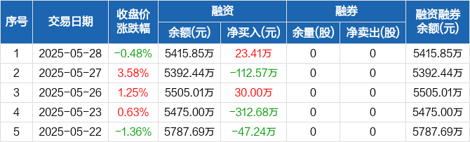 融资方面,当日融资买入371.96万元,融资偿还348.55万元,融资净买入23.41万元。融券方面,融券卖出0股,融券偿还0股,融券余量0股,融券余额0元。融资融券余额合计5415.85万元。