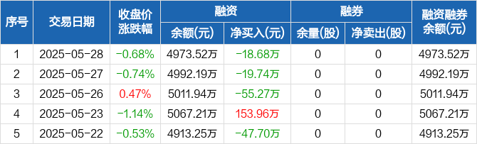 融资方面,当日融资买入59.95万元,融资偿还78.63万元,融资净偿还18.68万元,连续3日净偿还累计93.69万元。融券方面,融券卖出0股,融券偿还0股,融券余量0股,融券余额0元。融资融券余额合计4973.52万元。