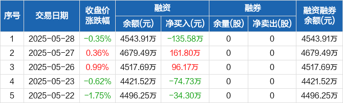 融资方面,当日融资买入141.35万元,融资偿还276.93万元,融资净偿还135.58万元。融券方面,融券卖出0股,融券偿还0股,融券余量0股,融券余额0元。融资融券余额合计4543.91万元。