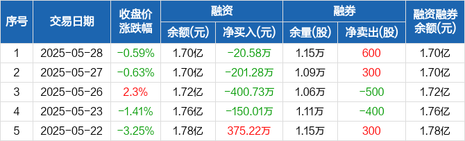 融资方面,当日融资买入154.4万元,融资偿还174.98万元,融资净偿还20.58万元,连续4日净偿还累计772.59万元。融券方面,融券卖出1000股,融券偿还400股,融券余量1.15万股,融券余额30.87万元。融资融券余额合计1.7亿元。