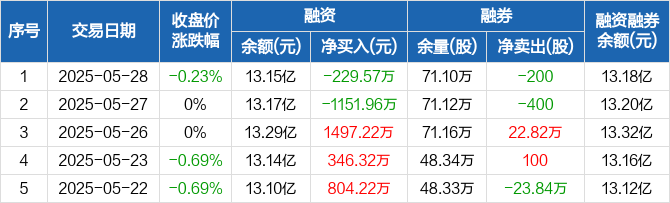 融资方面,当日融资买入1782.04万元,融资偿还2011.61万元,融资净偿还229.57万元。融券方面,融券卖出0股,融券偿还200股,融券余量71.1万股,融券余额305.73万元。融资融券余额合计13.18亿元。