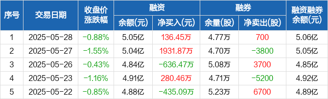 融资方面,当日融资买入810.43万元,融资偿还673.98万元,融资净买入136.45万元。融券方面,融券卖出700股,融券偿还0股,融券余量4.77万股,融券余额74.89万元。融资融券余额合计5.06亿元。