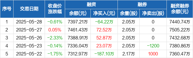 融资方面,当日融资买入86.97万元,融资偿还151.19万元,融资净偿还64.22万元。融券方面,融券卖出0股,融券偿还0股,融券余量2.05万股,融券余额43.53万元。融资融券余额合计7440.74万元。