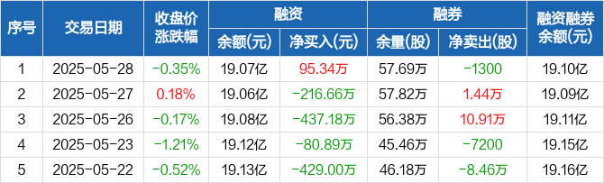融资方面,当日融资买入1148.12万元,融资偿还1052.78万元,融资净买入95.34万元。融券方面,融券卖出0股,融券偿还1300股,融券余量57.69万股,融券余额328.81万元。融资融券余额合计19.1亿元。