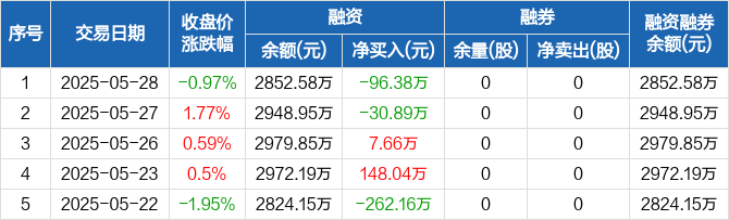 融资方面,当日融资买入130.59万元,融资偿还226.97万元,融资净偿还96.38万元。融券方面,融券卖出0股,融券偿还0股,融券余量0股,融券余额0元。融资融券余额合计2852.58万元。