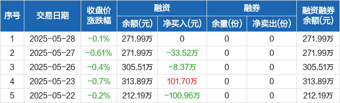 融资方面,当日融资买入7.68万元,融资偿还7.68万元,融资净买入0元。融券方面,融券卖出0份,融券偿还0份,融券余量0份,融券余额0元。融资融券余额合计271.99万元。