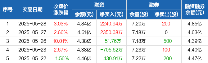 融资方面,当日融资买入1.65亿元,融资偿还1.43亿元,融资净买入2240.94万元。融券方面,融券卖出200股,融券偿还0股,融券余量7.2万股,融券余额151.56万元。融资融券余额合计4.85亿元。
