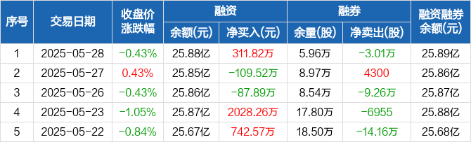 融资方面,当日融资买入2825.71万元,融资偿还2513.89万元,融资净买入311.82万元。融券方面,融券卖出6900股,融券偿还3.7万股,融券余量5.96万股,融券余额27.83万元。融资融券余额合计25.89亿元。