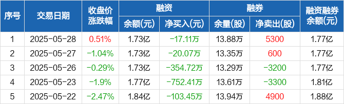 融资方面,当日融资买入1428.37万元,融资偿还1445.48万元,融资净偿还17.11万元,连续7日净偿还累计1687.85万元。融券方面,融券卖出5300股,融券偿还0股,融券余量13.88万股,融券余额383.78万元。融资融券余额合计1.77亿元。