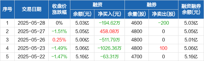 融资方面,当日融资买入682.25万元,融资偿还876.87万元,融资净偿还194.62万元。融券方面,融券卖出0股,融券偿还200股,融券余量4600股,融券余额3.6万元。融资融券余额合计5.03亿元。