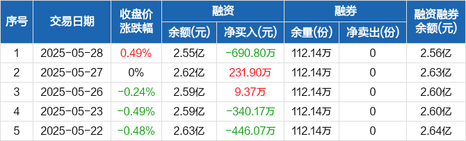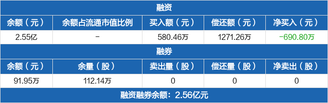 融资方面,当日融资买入580.46万元,融资偿还1271.26万元,融资净偿还690.8万元。融券方面,融券卖出0份,融券偿还0份,融券余量112.14万份,融券余额91.95万元。融资融券余额合计2.56亿元。