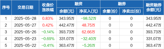 融资方面,当日融资买入102.02万元,融资偿还200.54万元,融资净偿还98.52万元。融券方面,融券卖出0份,融券偿还0份,融券余量0份,融券余额0元。融资融券余额合计343.95万元。