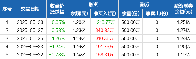 融资方面,当日融资买入863.28万元,融资偿还1077.05万元,融资净偿还213.77万元。融券方面,融券卖出0份,融券偿还0份,融券余量500万份,融券余额428万元。融资融券余额合计1.25亿元。