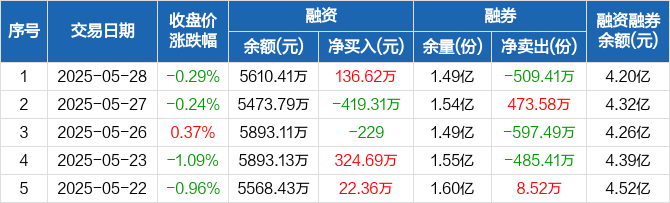 融资方面,当日融资买入464.48万元,融资偿还327.86万元,融资净买入136.62万元。融券方面,融券卖出10.74万份,融券偿还520.15万份,融券余量1.49亿份,融券余额3.64亿元。融资融券余额合计4.2亿元。