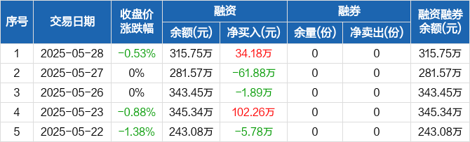 融资方面,当日融资买入106.06万元,融资偿还71.88万元,融资净买入34.18万元。融券方面,融券卖出0份,融券偿还0份,融券余量0份,融券余额0元。融资融券余额合计315.75万元。