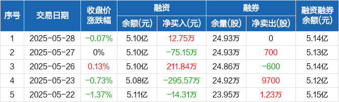 融资方面,当日融资买入545.36万元,融资偿还532.61万元,融资净买入12.75万元。融券方面,融券卖出0股,融券偿还0股,融券余量24.93万股,融券余额373.2万元。融资融券余额合计5.14亿元。