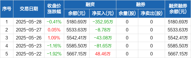 融资方面,当日融资买入75.12万元,融资偿还428.06万元,融资净偿还352.95万元,连续4日净偿还累计486.46万元。融券方面,融券卖出0股,融券偿还0股,融券余量0股,融券余额0元。融资融券余额合计5180.69万元。