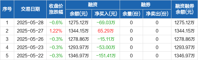 融资方面,当日融资买入54.46万元,融资偿还123.49万元,融资净偿还69.03万元。融券方面,融券卖出0份,融券偿还0份,融券余量0份,融券余额0元。融资融券余额合计1275.12万元。