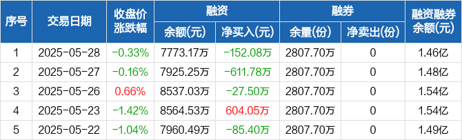 融资方面,当日融资买入368.94万元,融资偿还521.02万元,融资净偿还152.08万元,连续3日净偿还累计791.36万元。融券方面,融券卖出0份,融券偿还0份,融券余量2807.7万份,融券余额6845.17万元。融资融券余额合计1.46亿元。