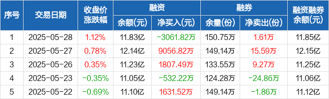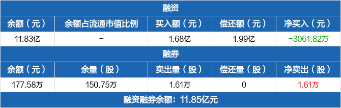 融资方面,当日融资买入1.68亿元,融资偿还1.99亿元,融资净偿还3061.82万元。融券方面,融券卖出1.61万份,融券偿还0份,融券余量150.75万份,融券余额177.58万元。融资融券余额合计11.85亿元。