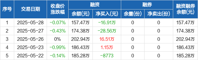 融资方面,当日融资买入140元,融资偿还16.92万元,融资净偿还16.91万元。融券方面,融券卖出0份,融券偿还0份,融券余量0份,融券余额0元。融资融券余额合计157.47万元。