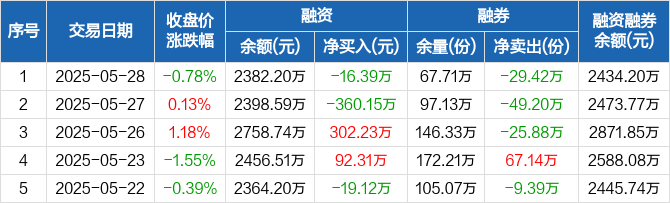 融资方面,当日融资买入149.05万元,融资偿还165.44万元,融资净偿还16.39万元。融券方面,融券卖出0份,融券偿还29.42万份,融券余量67.71万份,融券余额52万元。融资融券余额合计2434.2万元。