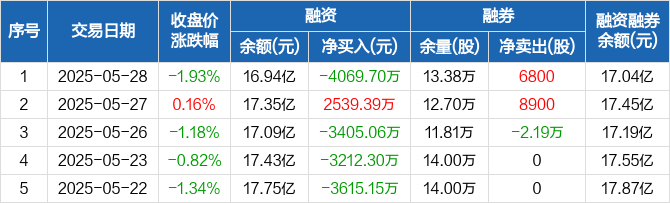 融资方面,当日融资买入2.22亿元,融资偿还2.63亿元,融资净偿还4069.7万元。融券方面,融券卖出8700股,融券偿还1900股,融券余量13.38万股,融券余额1041.57万元。融资融券余额合计17.04亿元。