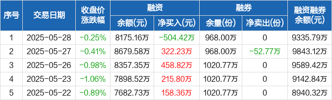 融资方面,当日融资买入260.56万元,融资偿还764.98万元,融资净偿还504.42万元。融券方面,融券卖出0份,融券偿还0份,融券余量968万份,融券余额1160.63万元。融资融券余额合计9335.79万元。