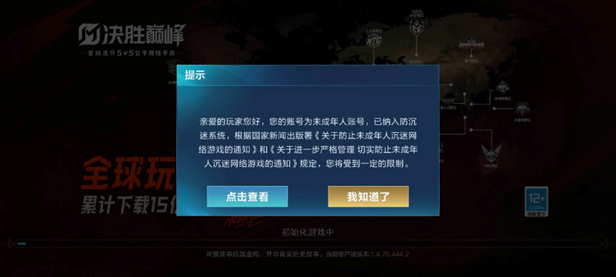 (图说:沐瞳《决胜巅峰》实名认证为未成年人后提示弹窗)