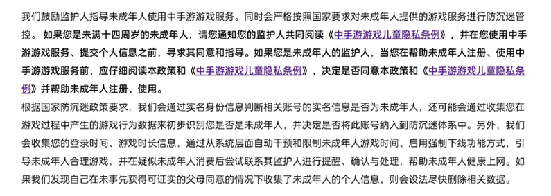 (图说:中手游《中手游游戏儿童隐私条例》中关于采集未成年人游戏相关信息以进行防沉迷的相关说明)