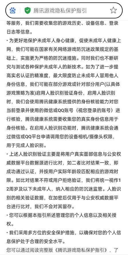 (图说:腾讯《游戏隐私保护指引》中关于收集未成年人信息采集及保护的相关表述)