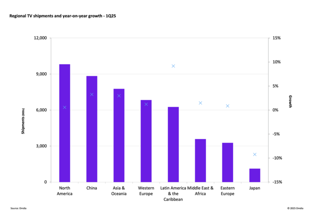 5月29日,Omdia最新数据显示,2025年第一季度,电视市场出货量同比增长2.4%,表现超出预期。得益于西欧和北美市场持续稳定的需求,以及中国政府补贴政策的带动,全球市场整体仍保持增长势头,即便面对日本市场疲软与关税的影响,依然实现增长。