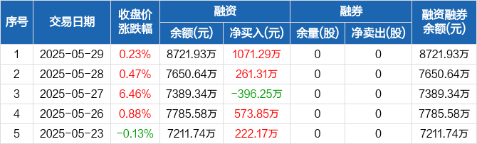 融资方面,当日融资买入1295.95万元,融资偿还224.67万元,融资净买入1071.29万元。融券方面,融券卖出0股,融券偿还0股,融券余量0股,融券余额0元。融资融券余额合计8721.93万元。