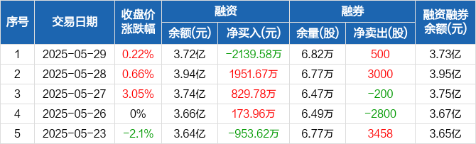 金宏气体融资融券信息显示,2025年5月29日融资净偿还2139.58万元;融资余额3.72亿元,较前一日下降5.44%。