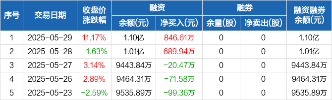 融资方面,当日融资买入3331.94万元,融资偿还2485.33万元,融资净买入846.61万元。融券方面,融券卖出0股,融券偿还0股,融券余量0股,融券余额0元。融资融券余额合计1.1亿元。