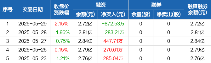 融资方面,当日融资买入902.94万元,融资偿还1775.47万元,融资净偿还872.53万元。融券方面,融券卖出0股,融券偿还0股,融券余量0股,融券余额0元。融资融券余额合计2.72亿元。